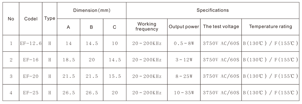 EF型磁芯相比EE型磁芯中柱面積稍大。它們被廣泛用于開關(guān)電源和多種電子線路中,具有適用范圍廣、工作頻率高、工作電壓范圍寬、輸出功率大、熱穩(wěn)定性能高等特點(diǎn)。EF型變壓器常用型號(hào)有EF-12.6,EF-16,EF-20,EF-25等。